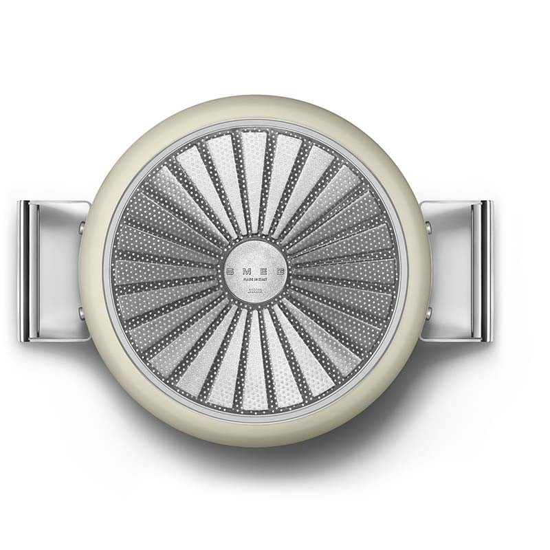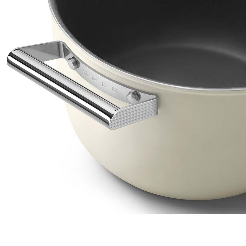 Panela alta antiaderente com tampa Smeg 50's Style de 26 cm de diâmetro, corpo em alumínio forjado e acabamento exterior bege creme fosco.