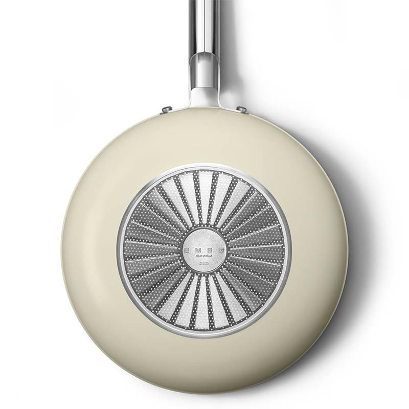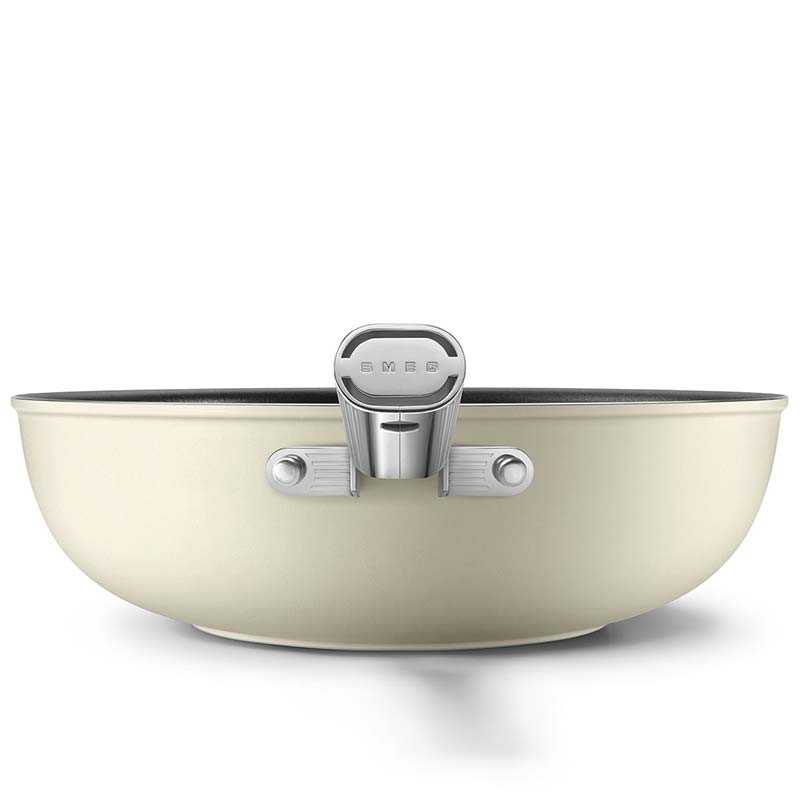 Wok antiaderente Smeg 50's Style com 30 cm de diâmetro, corpo em alumínio forjado e acabamento exterior bege creme mate.