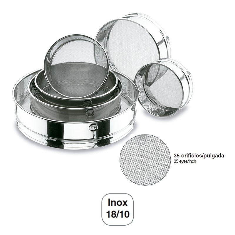 Peneira de aço inoxidável 18/10 de peneiramento fino de 35 furos por polegada ideal para peneirar farinha ou produtos similares, em operações de complemento de fabrico de pastelaria.