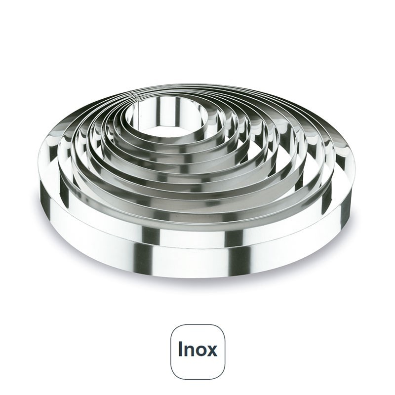 Aro redondo de aço inoxidável de 4,5 cm de altura para emplatar guarnições, saladas, sobremesas ou montar pratos como um steak tartar, ou similares. Disponível em vários diâmetros.