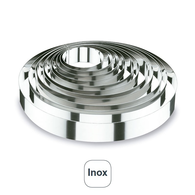 Aro redondo de aço inoxidável de 6 cm de altura para emplatar guarnições, saladas, sobremesas ou montar pratos como um steak tartar, ou similares. Disponível em vários diâmetros.