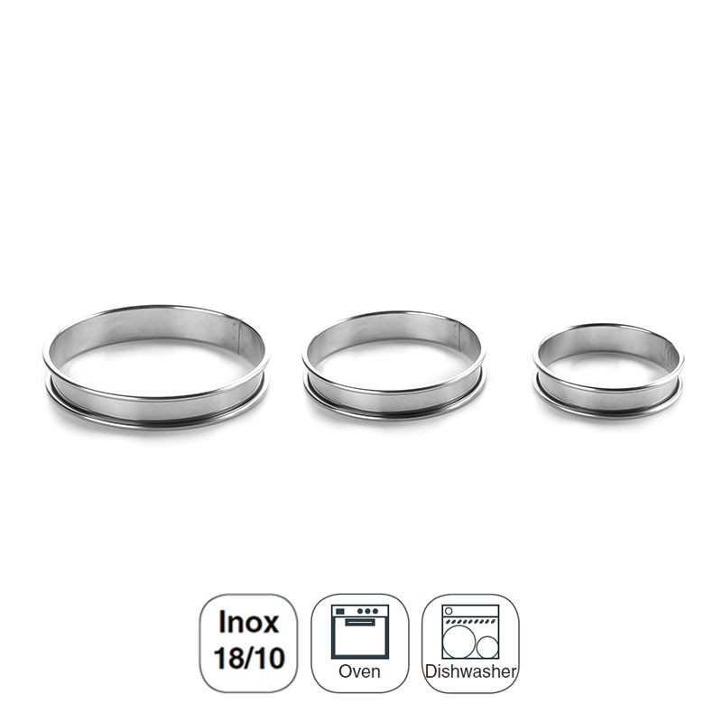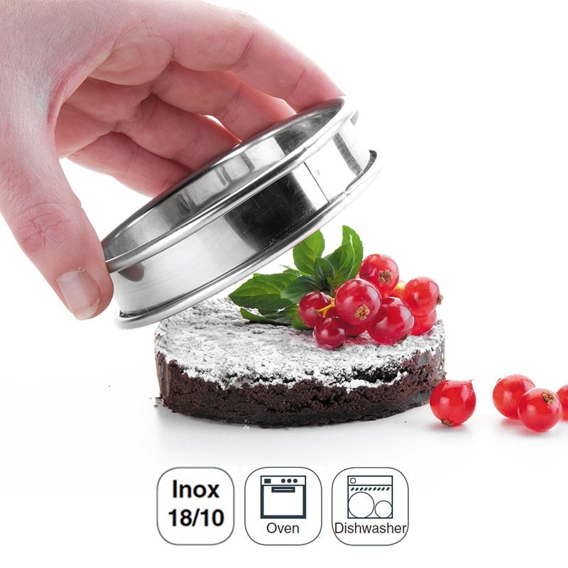 Aro redondo de aço inoxidável 18/10, com cantos arredondados e 2,2 cm de altura, ideal para emplatar pequenas guarnições ou sobremesas. Disponível em vários diâmetros.